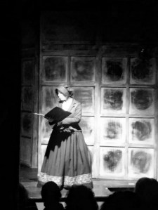 And – well: not always backstage – or at least not all the time, because… a few weeks ago Marcello, who plays Dickens himself in the prologue, had to miss a Sunday matinée. “You’re stepping in, Clara,” Nina decreed. And when I pointed out that I could hardly play Charles Dickens, she looked me over, and thoughtfully said: “No-o… Make up something.” So I thought of Mrs. Oliphant reading aloud the Waverley novels to groups of illiterate girls, and made up Ruth Grimshaw, a spinster doing something of the sort in 1843 London. Ruth became the alternate prologue, and was successful enough that I ended up playing her five times instead of the one. It was terrifying, exhilarating, and altogether wonderful.